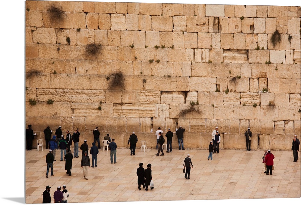 <p>Elevated view of the Western Wall Plaza with people praying at the wailing wall, Jewish Quarter, Old City, Jerusalem, Israel</p>