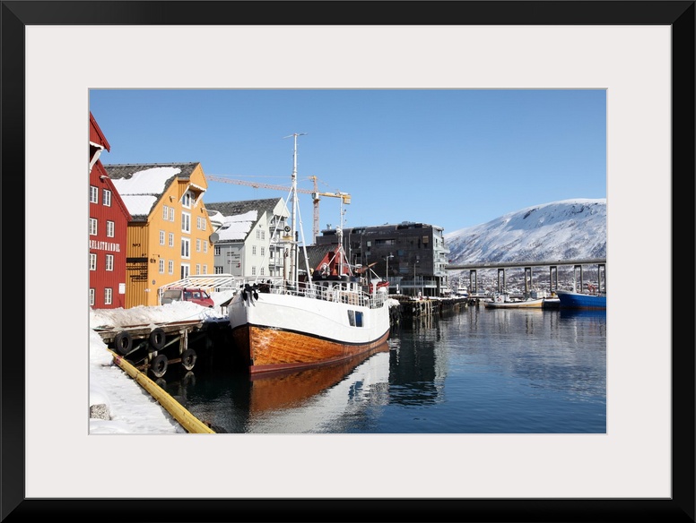 <p>The whaler that used to go to Svalbard, with warehouses behind that have been converted into offices, Tromso, Troms, Norway, Scandinavia, Europe.</p>