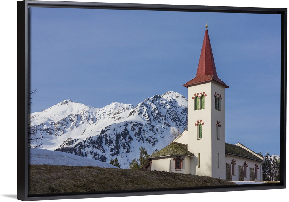 <p>The white alpine church framed by snowy peaks, Maloja, Bregaglia Valley, Canton of Graubunden, Engadine, Switzerland</p>