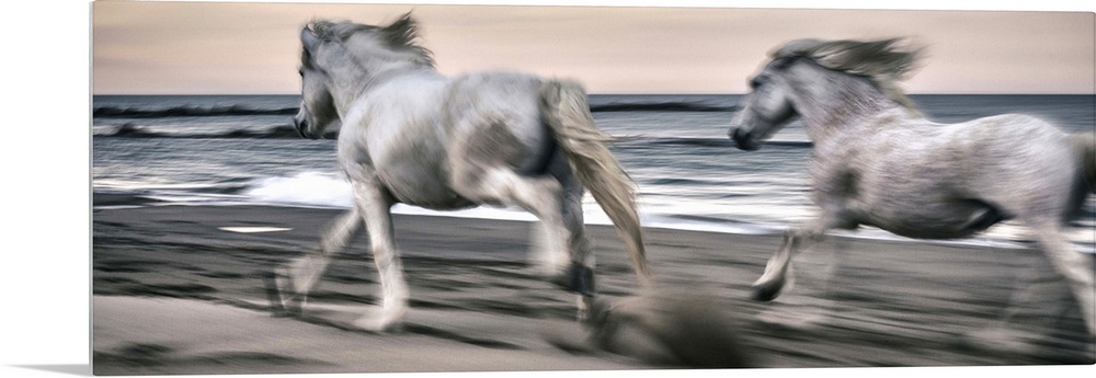 <p>The white horses of the Camargue on the beach in the south of France</p>