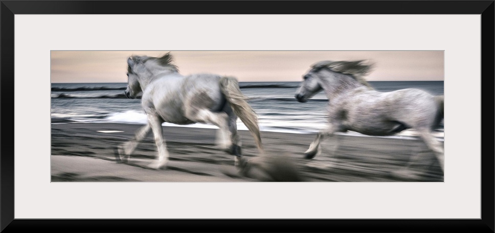 <p>The white horses of the Camargue on the beach in the south of France</p>