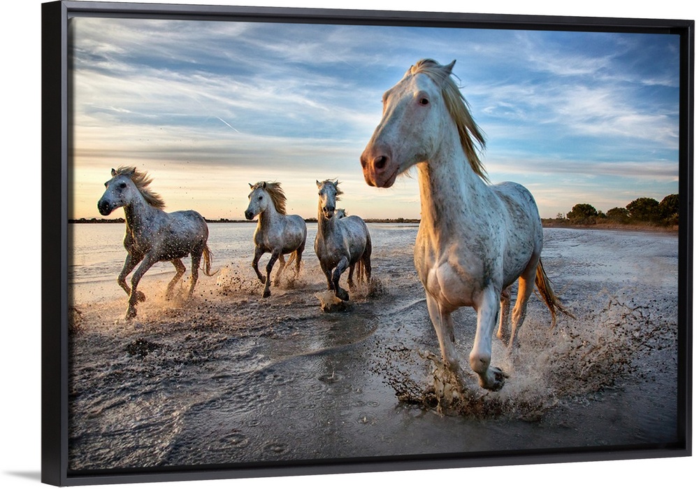 <p>The White Horses of the Camargue running in the water, Southern France.</p>