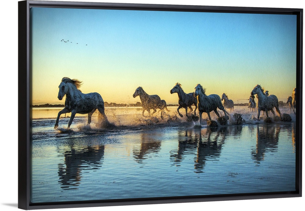 <p>The White Horses of the Camargue running in the water, Southern France.</p>