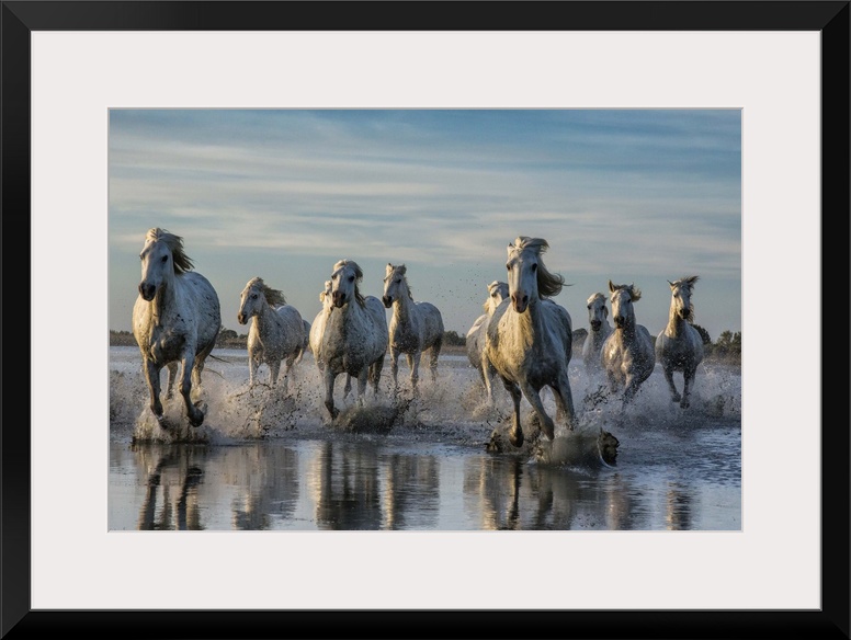 <p>The White Horses of the Camargue running in the water, Southern France.</p>