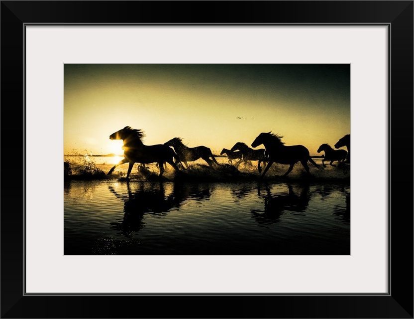 <p>The White Horses of the Camargue running in the water, Southern France.</p>