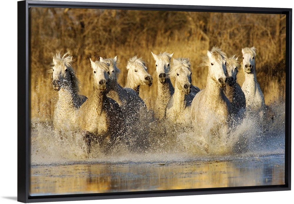 <p>The White Horses of the Camargue running in the water in the south of France</p>
