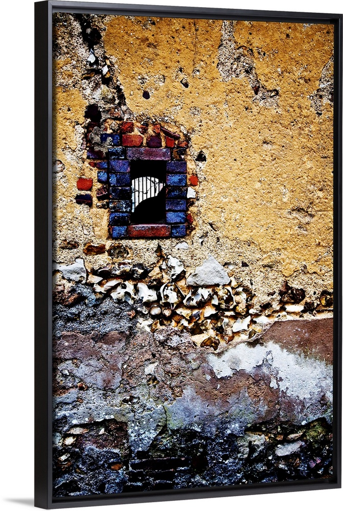 <p>A crumbling wall in golden yellow with a small window.</p>