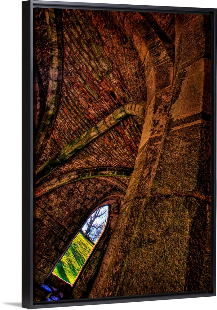 <p>A dynamically angled gothic arched window beneath an ancient stone ceiling with views out to green fields and a winter tree.</p>