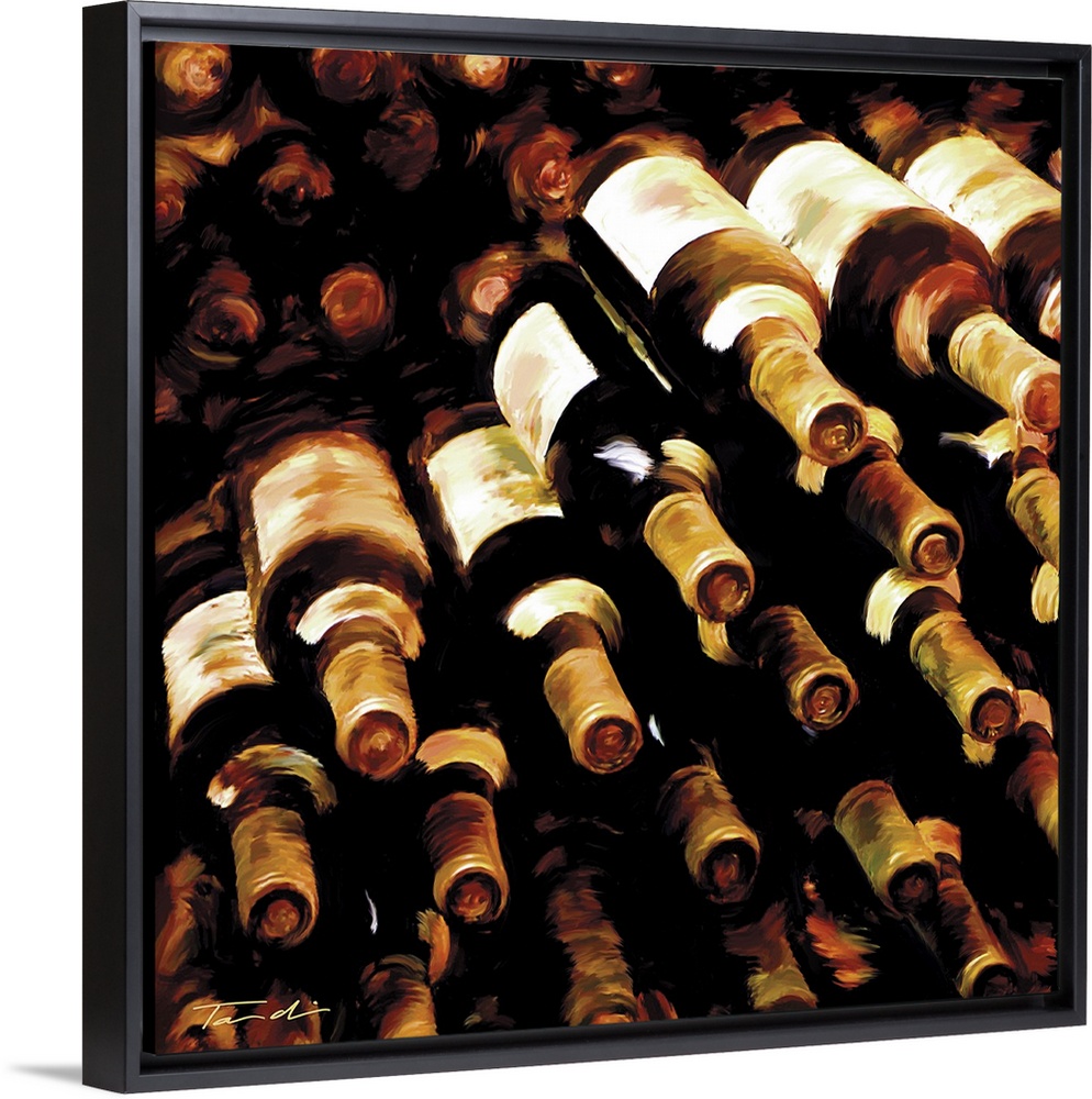 <p>Square contemporary painting of a stack of wine bottles.</p>