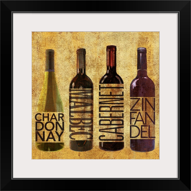 <p>Four bottles of wine, including Chardonnay, Malbec, Cabernet, and Zinfandel.</p>