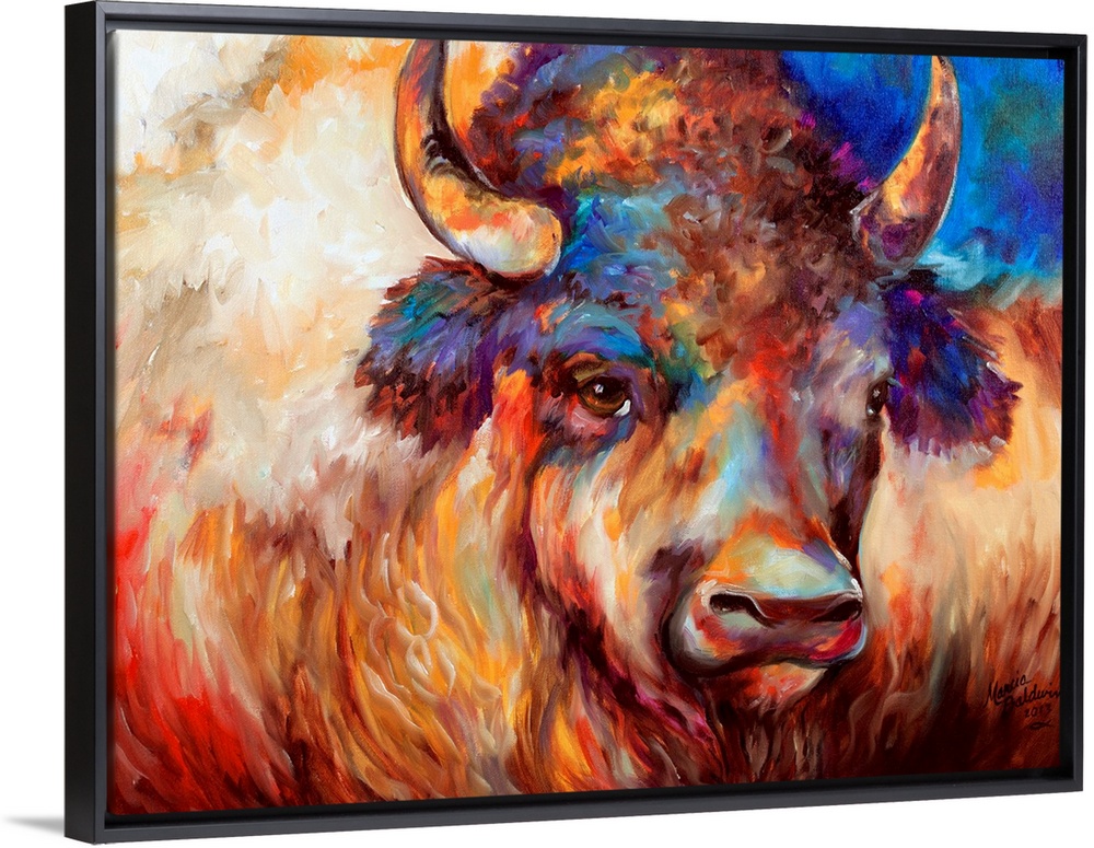 <p>Abstract painting of a buffalo close up with brown, red, orange, yellow, blue, and purple hues.</p>