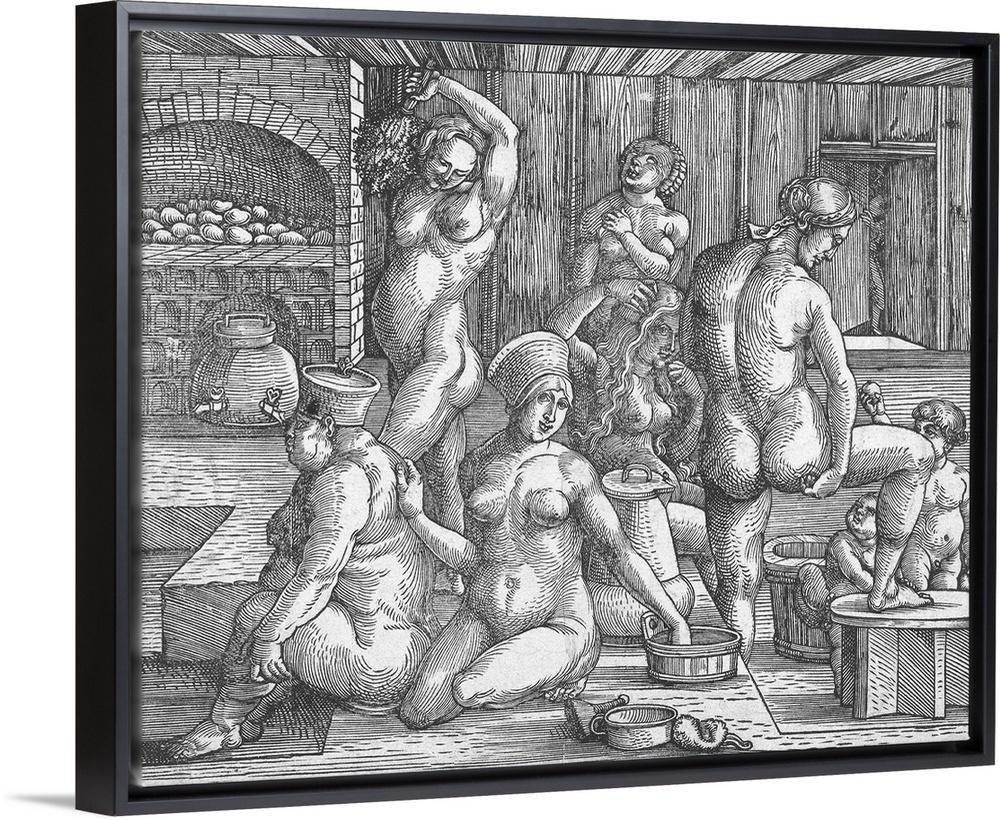 <p>The Women's Bath, by Albrecht Durer, 1496-1501, German wood engraving. Six women and two small children in a bath and sauna.</p>