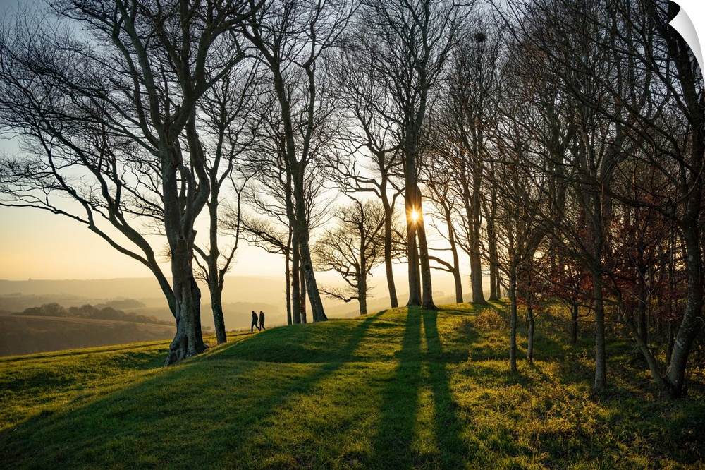 <p>The winter sun setting behind trees at Chanctonbury Ring on the South Downs in west Sussex, England.</p>