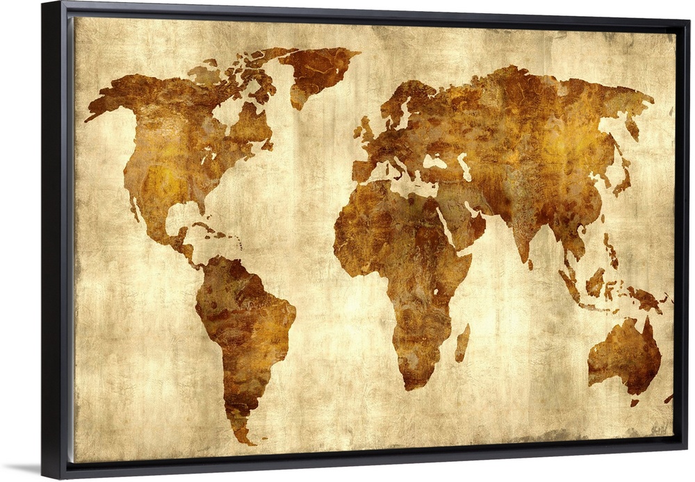 <p>Rustic map of the World with no labeling in bronze and gold hues.</p>