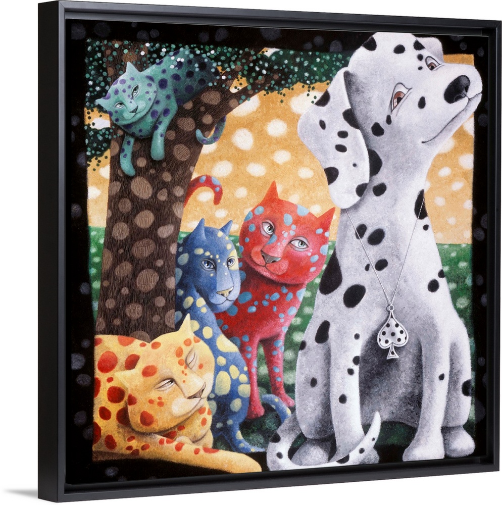 <p>Square illustration of an uncertain dalmatian sitting next to four spotted cats near a tree.</p>
