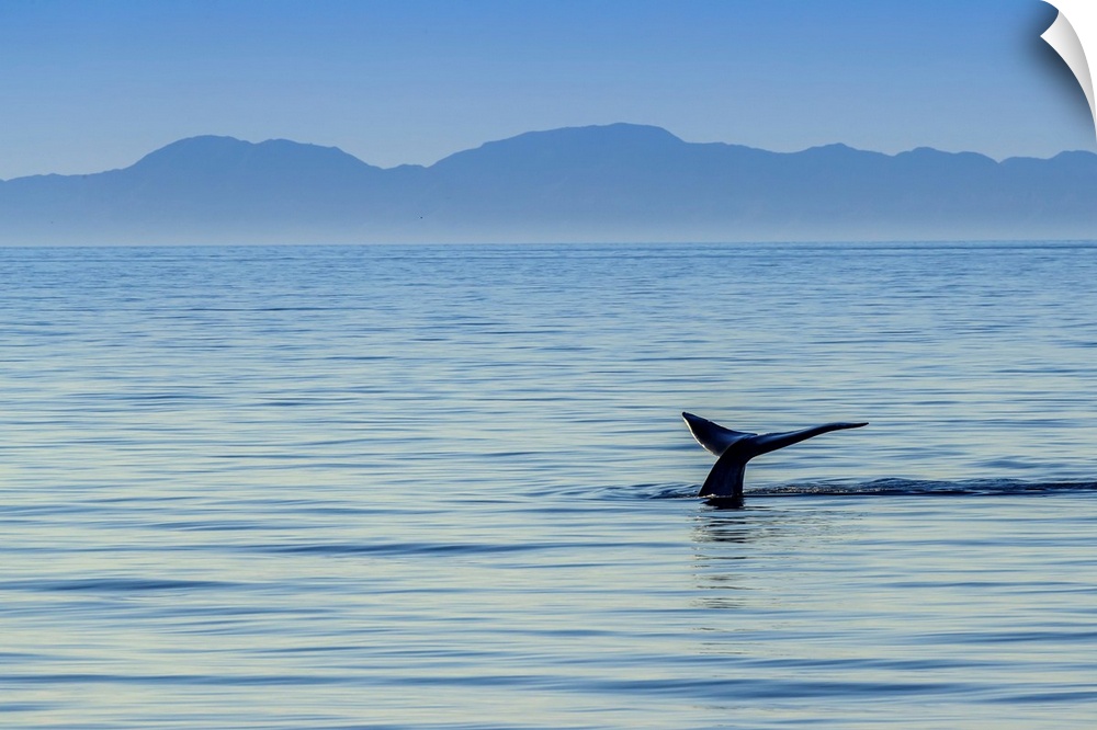 <p>The world's largest animal, a blue whale raises its fluke out of the water.</p>