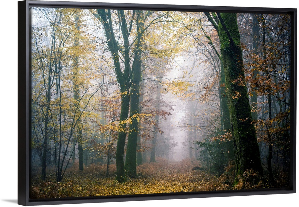 <p>Path crossing a foggy forest at fall with yellow leaves on the ground, Broceliande forest in France.</p>