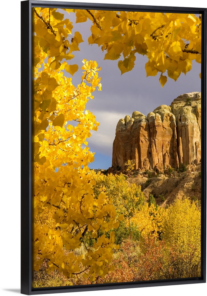 <p>Portrait photograph from the National Geographic Collection of golden leaves in the foreground, surrounding a large rock formation in the background.</p>