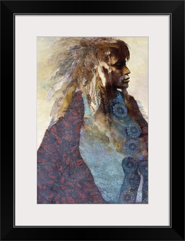 <p>A contemporary painting of a male figure standing in profile draped in a colorful patterned blanket with an elaborate headdress of feathers on.</p>