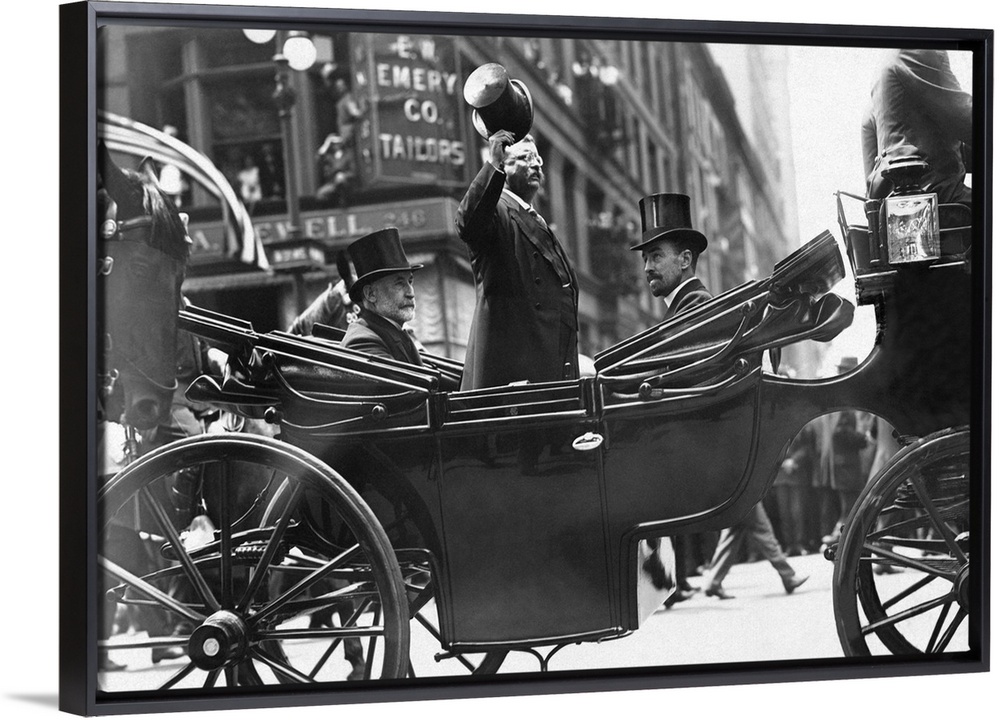 <p>June 23, 1910 - Former President Theodore Roosevelt standing in a horse drawn carriage, tipping his hat to onlookers on Fifth Avenue NYC, while Cornelius Vanderbilt and New York Mayor William Gaynor remain seated.</p>