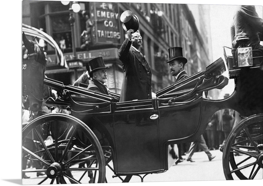 <p>June 23, 1910 - Former President Theodore Roosevelt standing in a horse drawn carriage, tipping his hat to onlookers on Fifth Avenue NYC, while Cornelius Vanderbilt and New York Mayor William Gaynor remain seated.</p>
