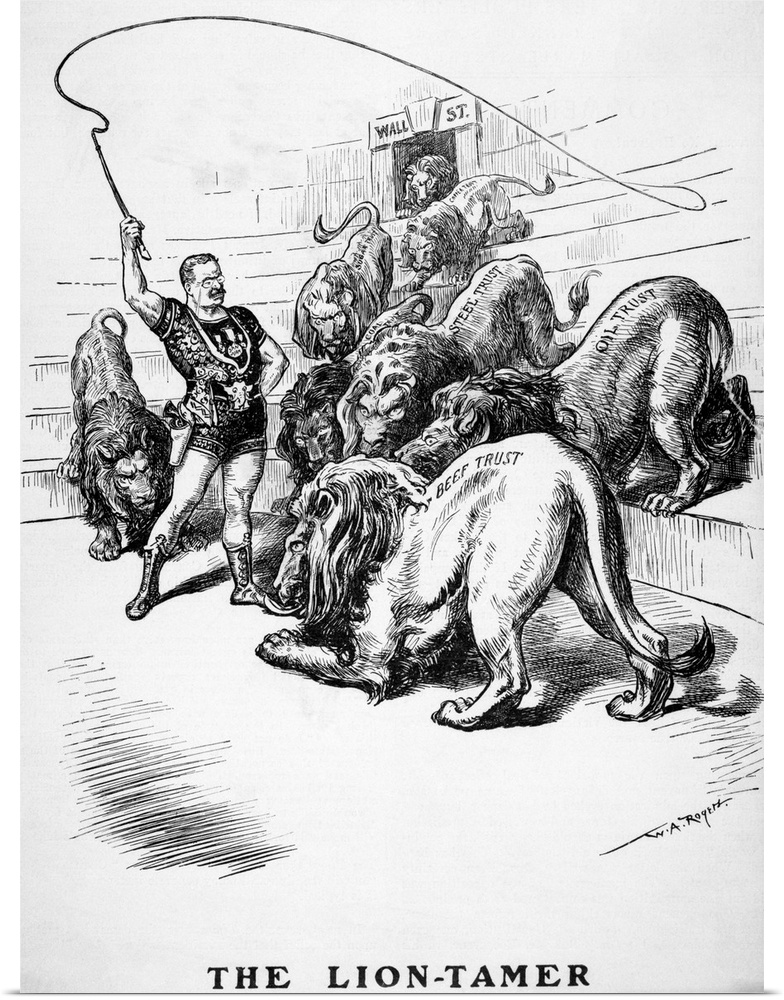 <p>1904-Political cartoon, The Lion Tamer. It shows President Theodore Roosevelt as the lion tamer, in the arena of Wall Street, taming the lions, which are the oil trust, the beef trust, the steel trust, and others.</p>