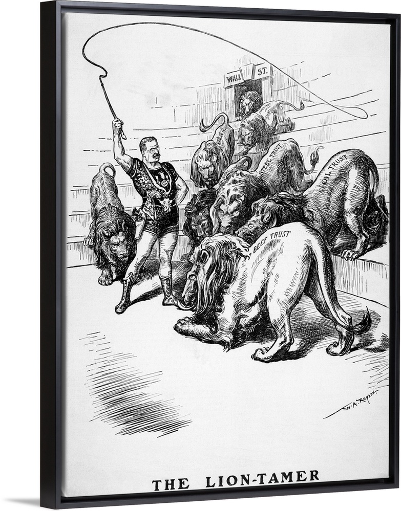 <p>1904-Political cartoon, The Lion Tamer. It shows President Theodore Roosevelt as the lion tamer, in the arena of Wall Street, taming the lions, which are the oil trust, the beef trust, the steel trust, and others.</p>