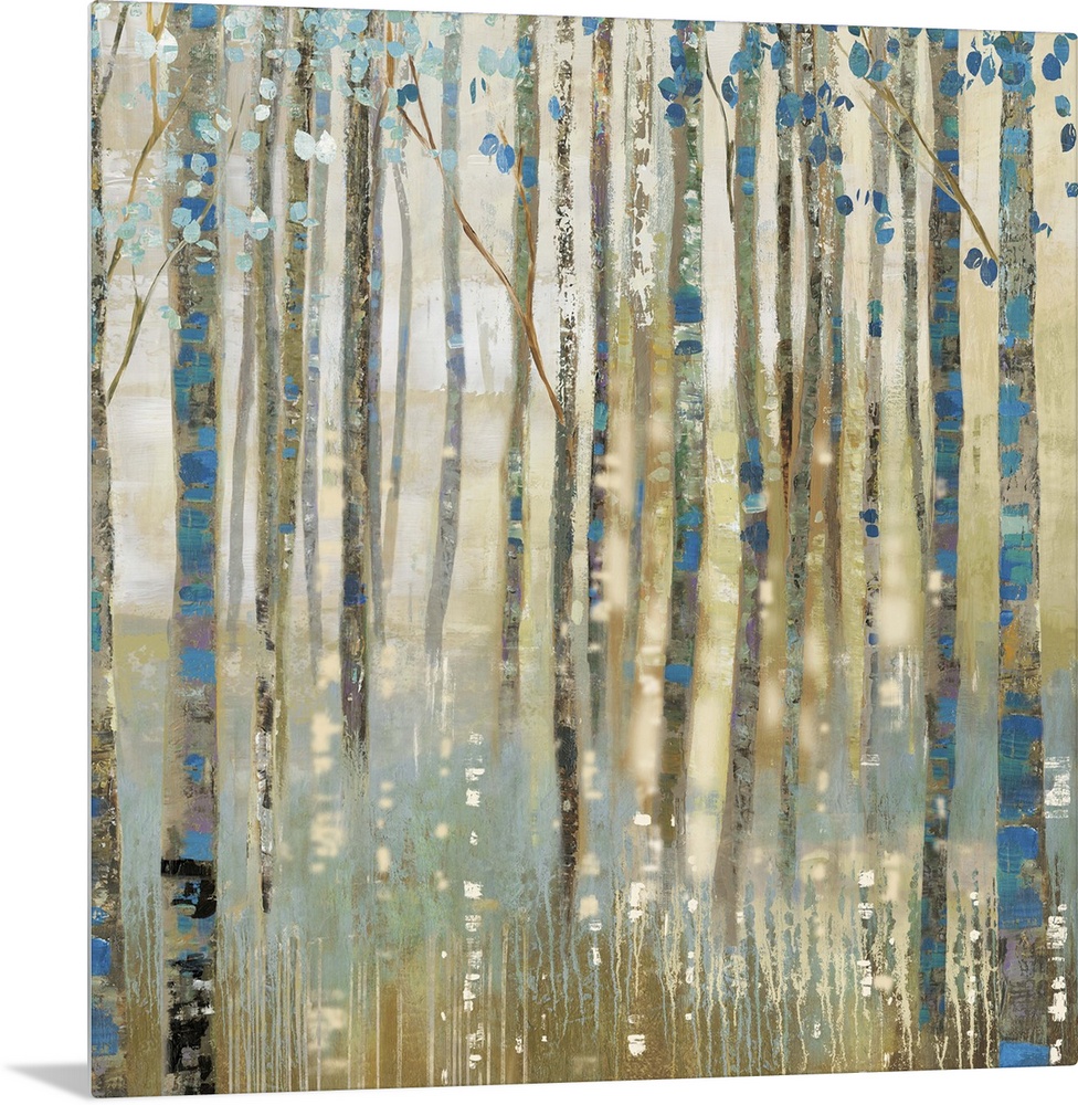 <p>Contemporary home decor artwork of a golden forest with blue accented trees.</p>
