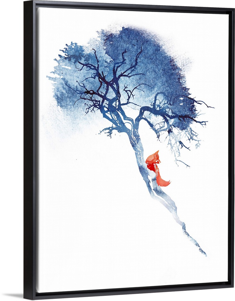 <p>Contemporary artwork that features a lone red fox climbing a blue tree.</p>