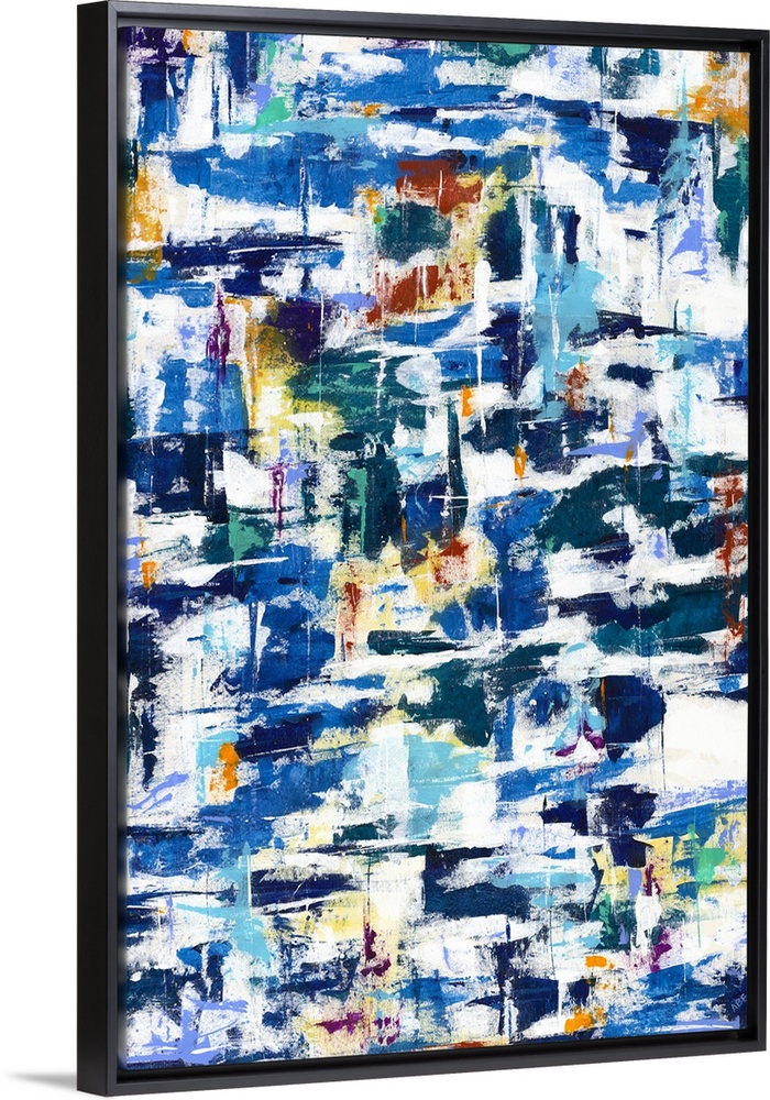 <p>Large abstract artwork with busy brushstrokes in shades of blue, yellow, orange, green, and red.</p>