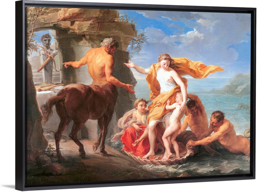 <p>Thetis Entrusting Achilles to the Centaur Chiron, by Pompeo Girolamo Batoni, 1761 ante, 18th Century, oil on canvas, cm 102 x 138 - Italy, Emilia Romagna, Parma, National Gallery. All. Centaur Chiron girl Thetis boy child Achilles niche rock bust statue H</p>