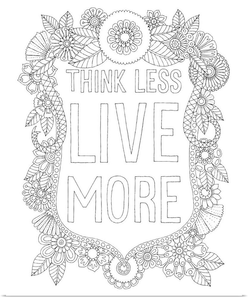 <p>Black and white line art with the phrase "Think Less Live More" written inside a floral design.</p>