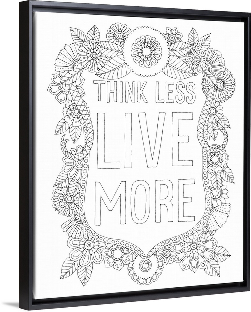 <p>Black and white line art with the phrase "Think Less Live More" written inside a floral design.</p>