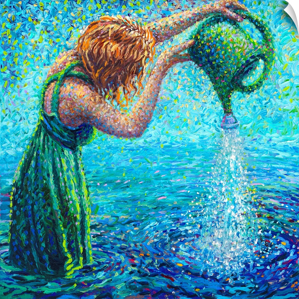 <p>Brightly colored contemporary artwork of a woman pouring water into a lake.</p>