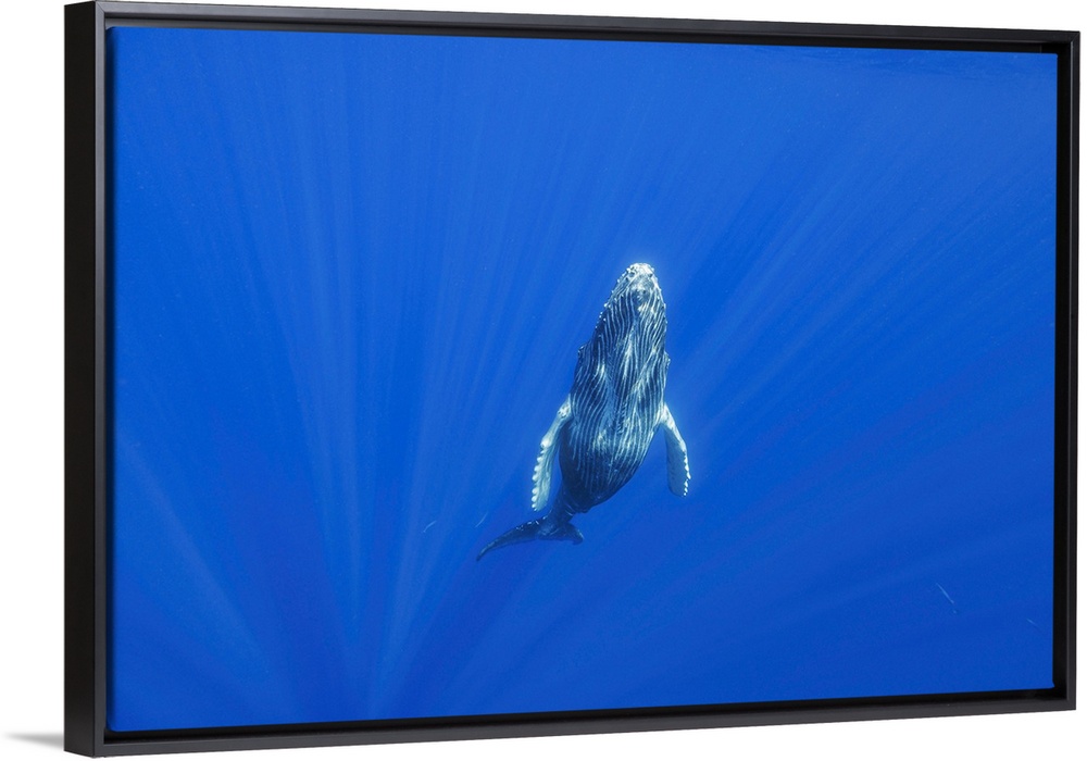 <p>This curious humpback whale calf (megaptera novaeangliae) investigated the diver on the surface before returning to it's mother below, Hawaii, united states of America.</p>