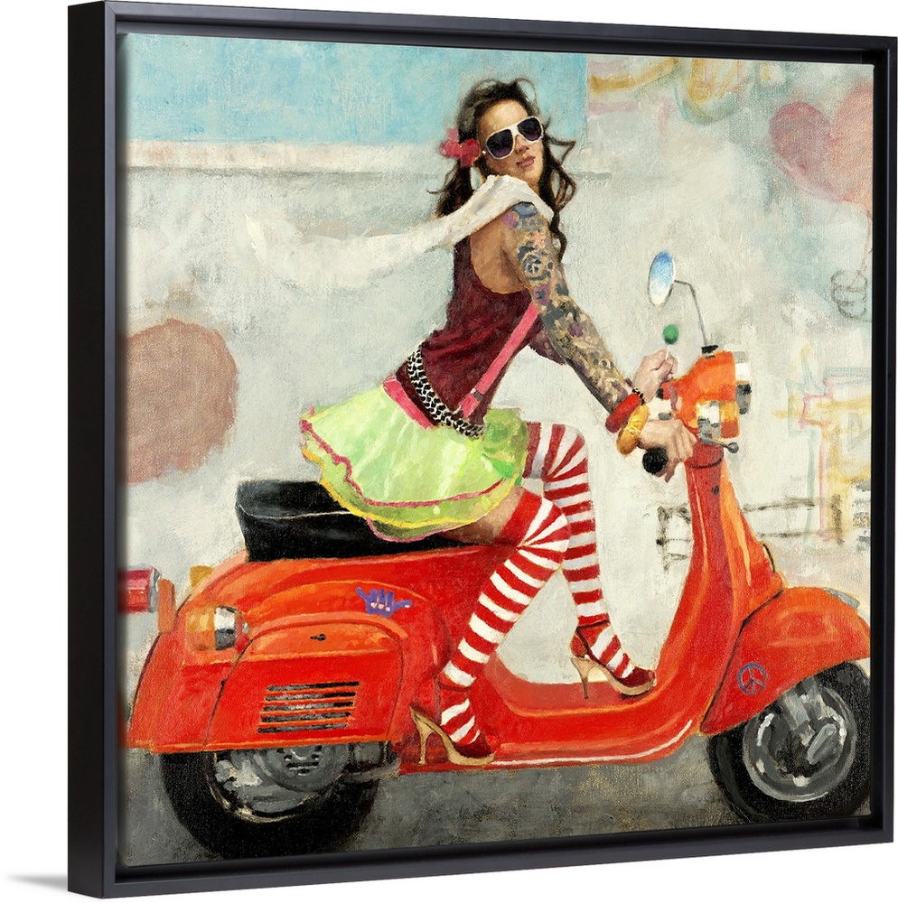 <p>Contemporary artwork of a woman wearing mismatched clothing riding a bright red scooter.</p>