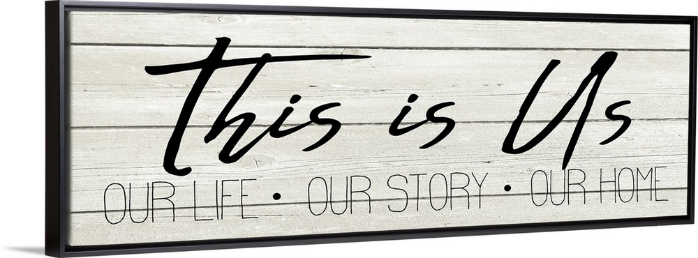 <p>"This is Us, Our Life, Our Story, Our Home" on a white wood plank background.</p>