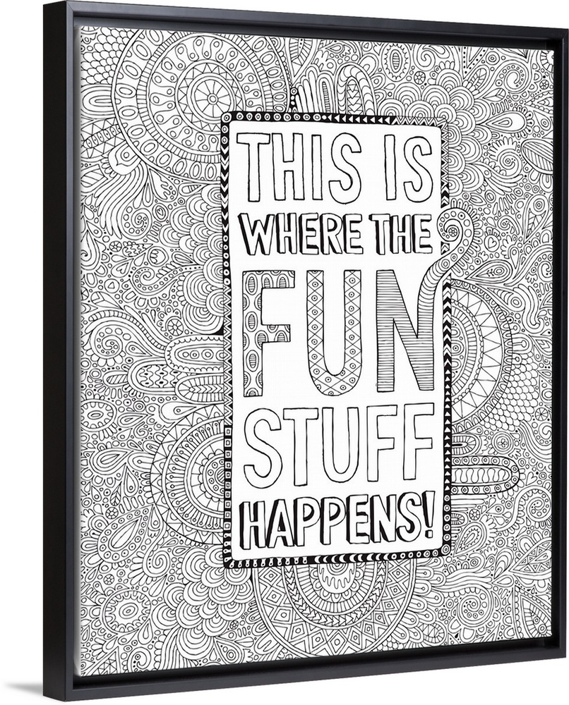 <p>Black and white line art with the phrase "This is Where The Fun Stuff Happens!" written in a box surrounded by an intricately designed background.</p>
