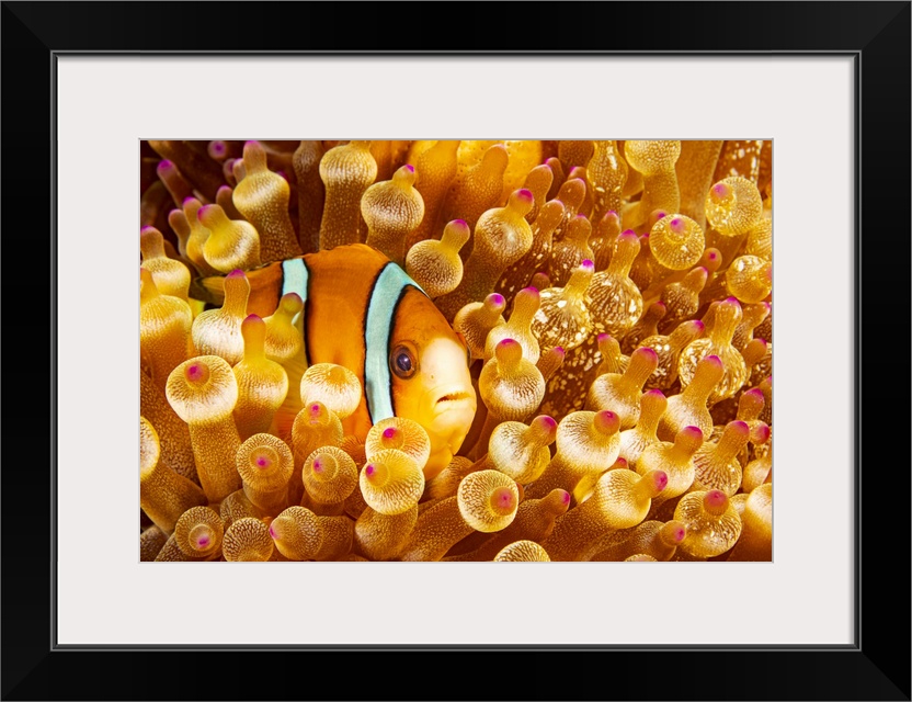 <p>This Orange-fin anemonefish (Amphiprion chrysopterus) is pictured hiding in it's host anemone; Philippines.</p>