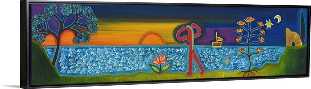<p>Contemporary painting of a person walking along the ocean at sunset.</p>