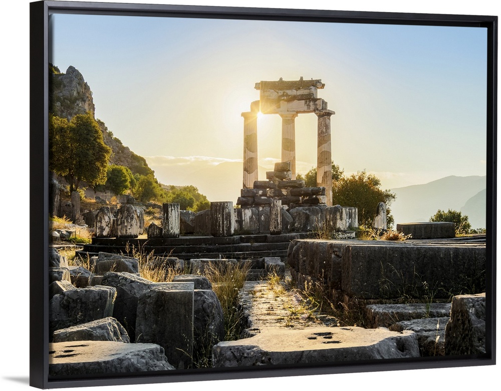 <p>Tholos of Delphi, Temple of Athena Pronaia, sunrise, Delphi, Phocis, Greece</p>