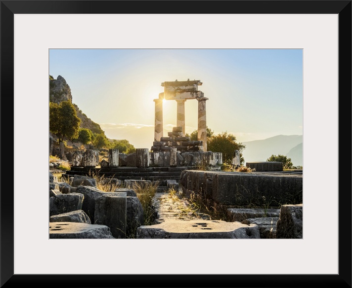 <p>Tholos of Delphi, Temple of Athena Pronaia, sunrise, Delphi, Phocis, Greece</p>