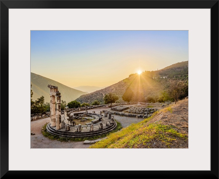 <p>Tholos of Delphi, Temple of Athena Pronaia, sunset, Delphi, Phocis, Greece</p>
