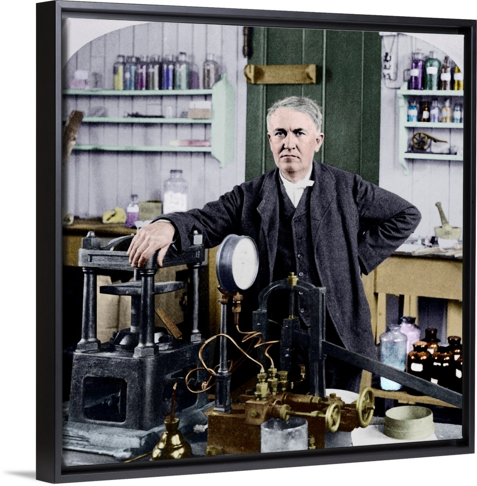 <p>Thomas Alva Edison (1847-1931), US inventor, in his laboratory at East Orange, New Jersey, USA. Edison is famous for inventing or improving devices such as the phonograph and the electric light bulb. Edison was one of the first inventors to build research laboratories to make and develop inventions. He also founded several companies, and filed over 1000 patents. Other work included improvements to telegraphy, cameras, and motion picture cameras, as well as promoting his DC electrical distribution systems. He also discovered the Edison Effect, on which thermionic valves are based. Photographed circa 1901.</p>
