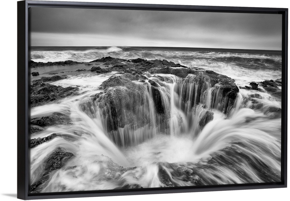 <p>A black and white photograph of a well in the ocean surrounded by rushing water.</p>