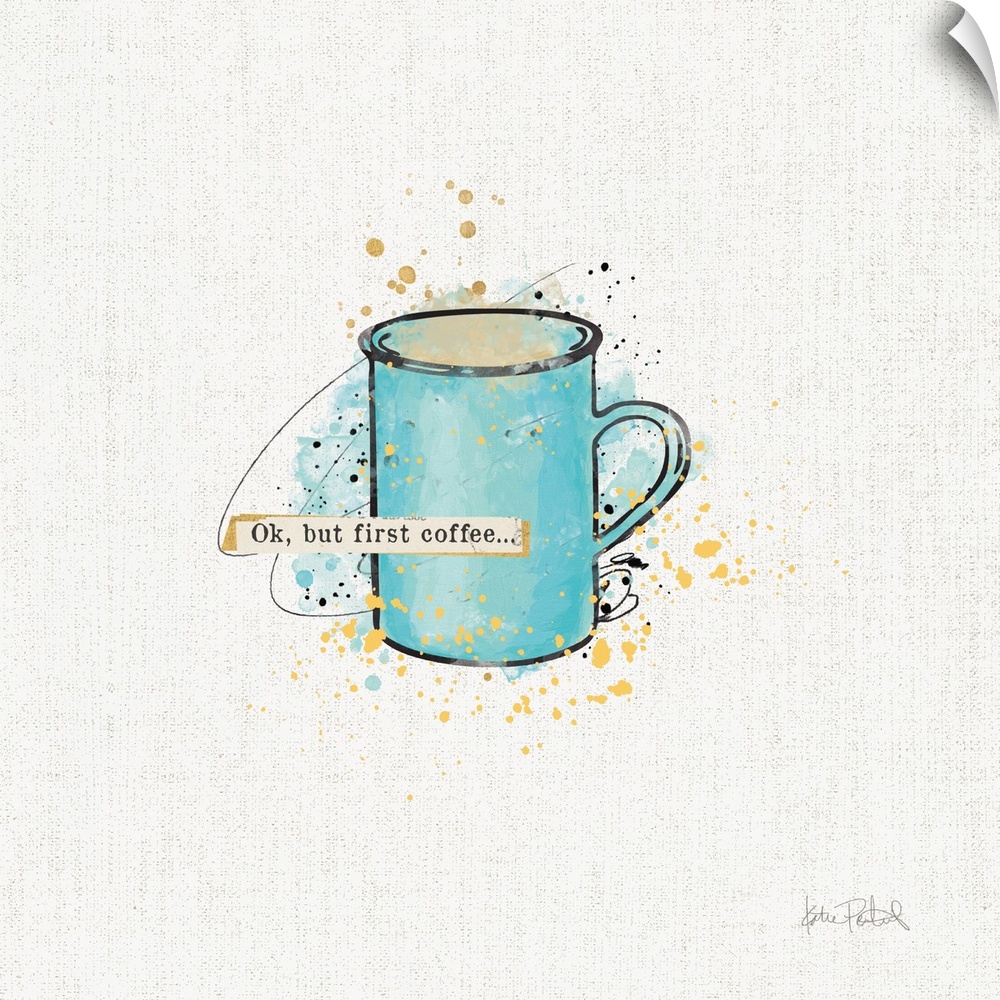<p>Decorative artwork of a blue mug with the text "Ok, but first coffee..." and colored speckles behind it.</p>