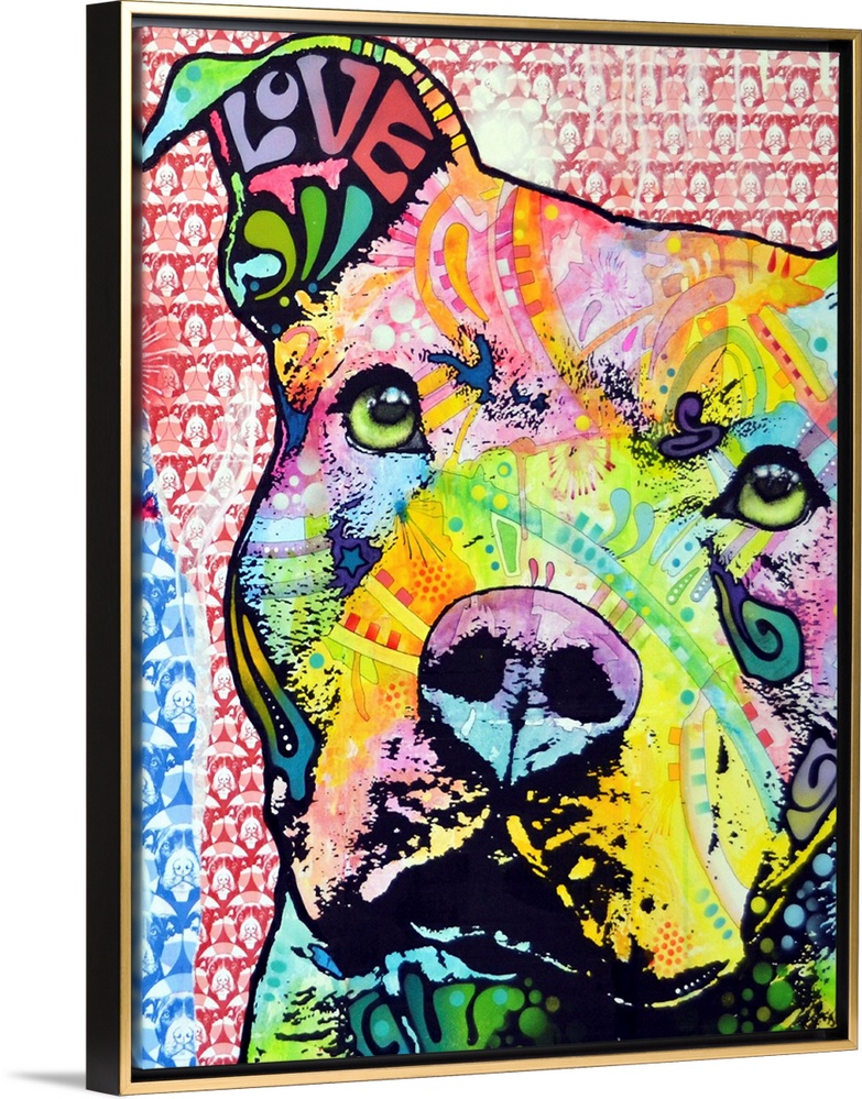<p>Vertical digital artwork on a large wall hanging of the face of a pit bull dog, filled with vibrant colors and decorative graffiti, on a background of a small image of a dogs face in a repeating pattern.</p>