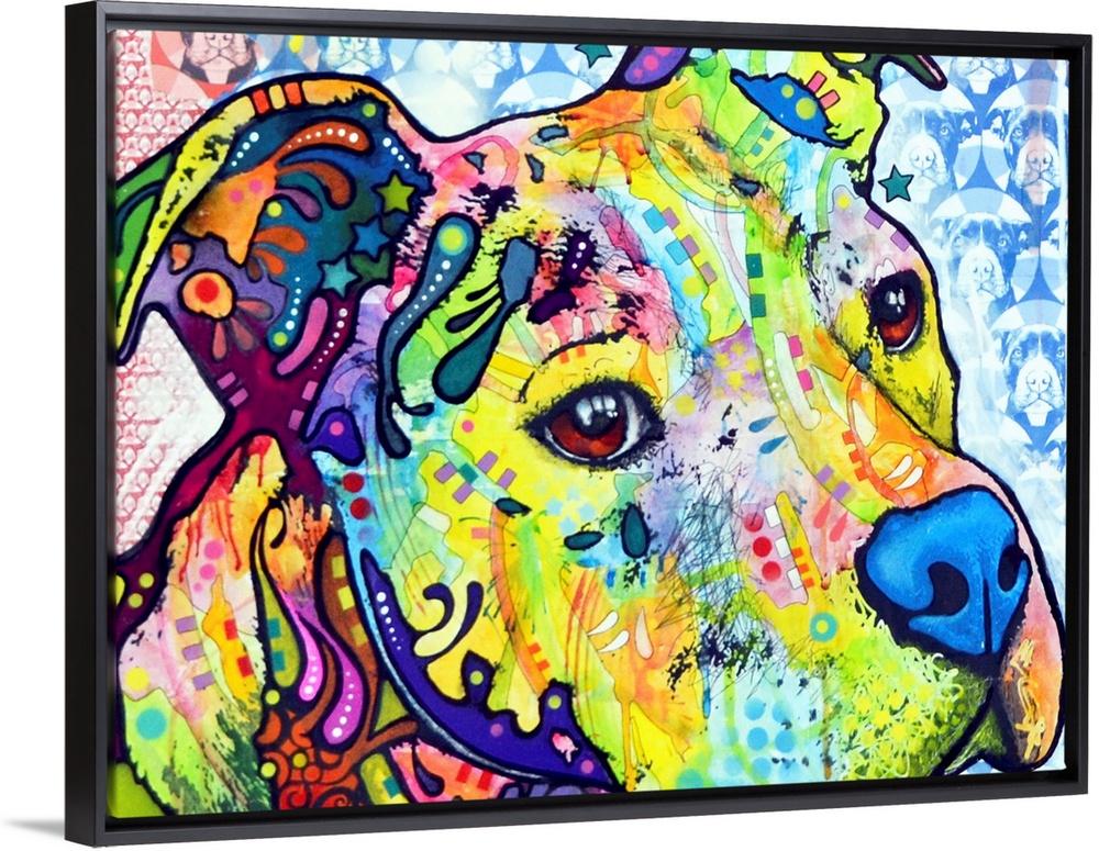 <p>Contemporary artwork of a dog's outline filled with several multicolored patterns with a repeating dog face pattern in the background.</p>