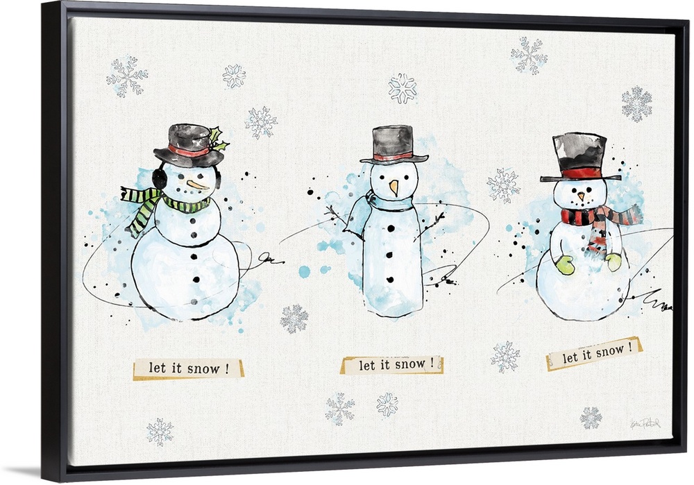 <p>Decorative artwork of snowmen with the text "let it snow! let it snow! let it snow!" and a neutral linen textured background.</p>
