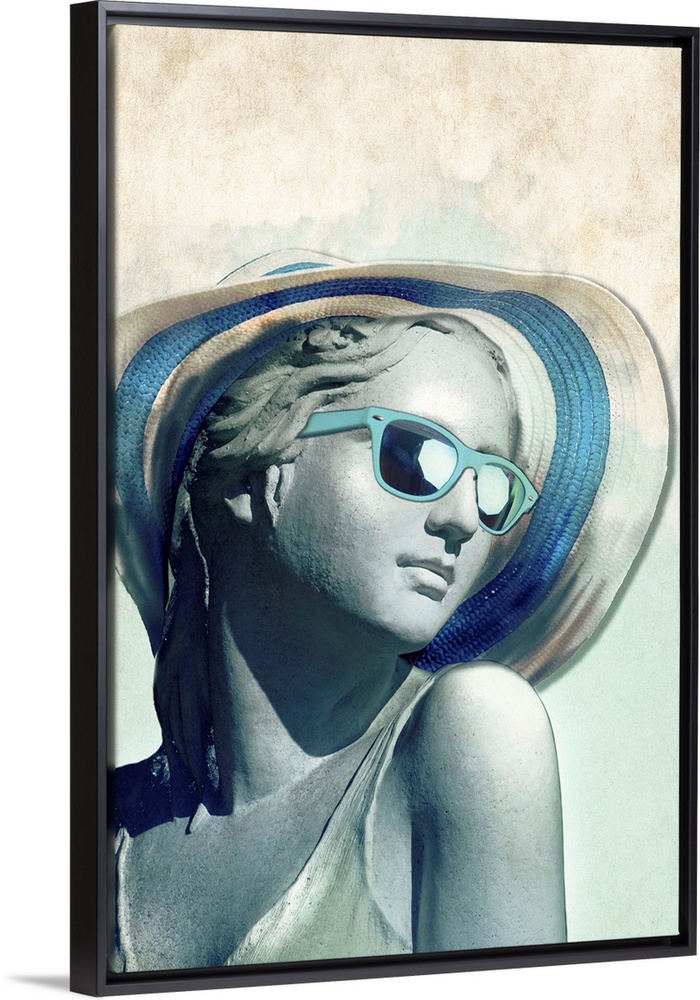 <p>Illustration of a statue wearing a large sun hat and blue sunglasses.</p>
